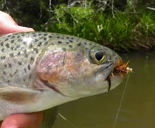 The fish were hunkered down on the under cut on the far side. Especially if there was over hang willows. It went on till I called it quits and had to go. Cast up stream and swing the sreamer as tight to the bank as possible w/ slight bumps to get there attention. If there was a fish there..they would eat. This went on for more than dozen rainbows and one brown on about a 150 yard stretch. Browns and olive #6 crystal buggers.